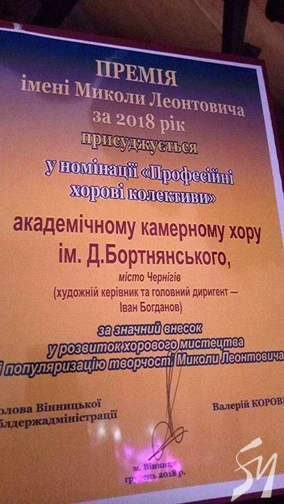 Академічний камерний хор ім. Дмитра Бортнянського (художній керівник і диригент Іван Богданов) здобув Всеукраїнську премію імені Миколи Леонтовича, яку вручають за визначні заслуги в розвитку музичного і хорового мистецтва.