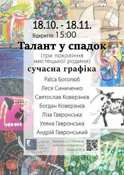 На виставці презентуватимуться графічні роботи трьох поколінь художників однієї родини: Раїси Боголюб, Лесі Синиченко, Святослава та Богдана Коверзнєвих, Єлизавети, Уляни та Андрія Гавронських.