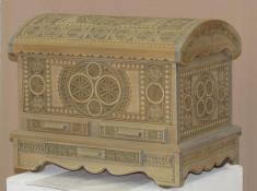 Серед різноманіття різьблених виробів завжди привертають увагу скрині величезних розмірів, які буквально вражають досконалістю пропорцій та гармонійністю орнаментального оздоблення поверхні. Так звана «весільна» скриня має колеса та кілька прискринків.