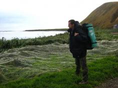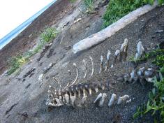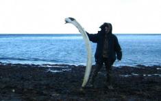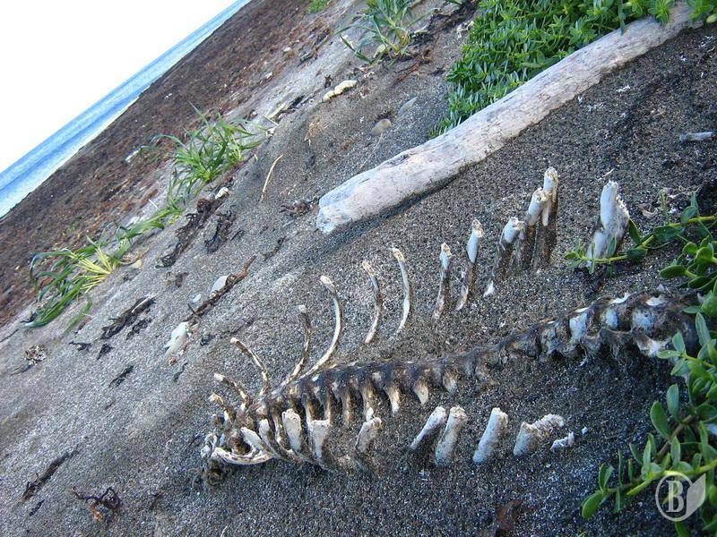 Морской прибой приносит не только большое количество плавника и мертвых крабов, а еще и разнообразный хлам, который попадает в море: куски рыболовецких сетей, обрывки канатов, пластмассовые буи, пластиковые и стеклянные бутылки, лотки из-под яиц и даже люминесцентные лампы. А вот и ребро маленького кита. Когда поднял эту „косточку”, то она оказалась больше моего роста, а весила не меньше полцентнера.
