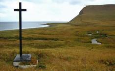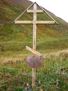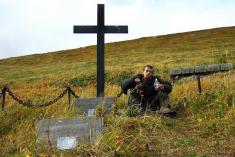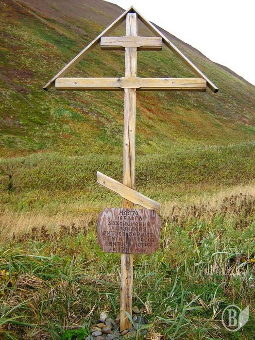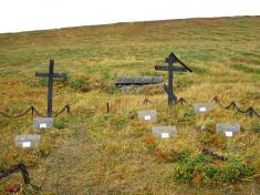 Подхожу к кресту, читаю: «Место первого захоронения командора Витуса Беринга и пяти матросов «Святого Петра» в 1741 году». Немного дальше и выше, на склоне горы замечаю еще несколько крестов, к которым ведёт деревянная лестница. Поднимаюсь к высокому черному железному кресту-памятнику, внизу около которого – бронзовая плита с отлитыми словами: «1681-1741. Великому мореплавателю капитану-командору Витусу Берингу от жителей Камчатки. Июнь 1966».