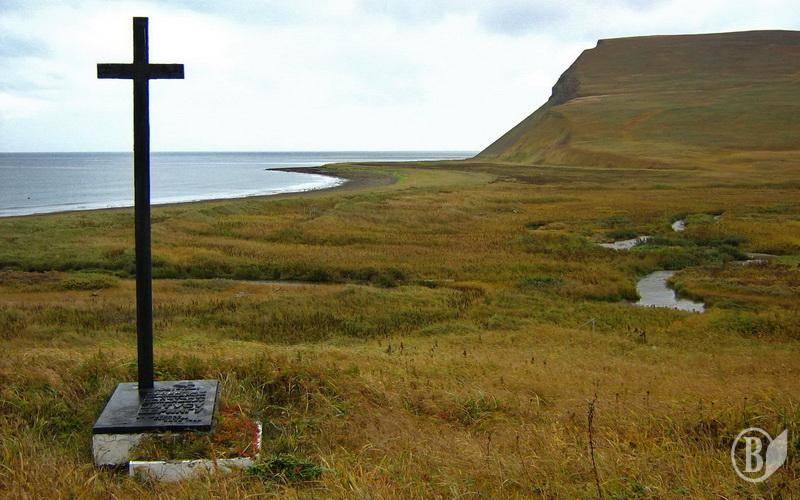 Синяя ершистая безбрежность Берингова моря. Пустынный берег. Белое обрамление наката. Мрачный пейзаж долины. Крест у подножия горы, рядом ветер треплет выцвелую траву. Невесело было здесь команде Беринга, которая жила в песчаных ямах, утеплённых шкурами и прикрытыми сверху лоскутами парусов. Недаром натуралист экспедиции Георг Стеллер называл эти ямы „могилами”.
