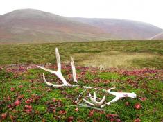 И в конечном итоге болото закончилось и началась нетронутая командорская тундра: невысокие кустики с неизвестными мне красными ягодами, черника, грибы, ручьи, небольшие и неглубокие озерца, с чистой и прозрачной водой. Сверяя свой путь по карте, натолкнулся в тундре на оленьи рога.