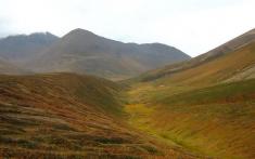 В Половинной долине немало маленьких озерец, а то и просто луж с прозрачной водой и песчаным дном. Они наполняются водой из-под земли, о чем свидетельствовали воронки и отверстия в песке на дне этих водоемов. На привалах лакомился черникой, брусникой, шикшей. Взошел на водораздельный перевал, отсюда Берингового моря уже не было видно.