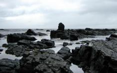 Следующий день стал самым тяжелым за время похода по острову. Еще накануне, осмотрев в бинокль тихоокеанское побережье, понял, что просто так его не пройти, потому что во многих местах почти отвесные скалы подходили к самому океану. Правда, при себе была карта отливов, которую дал Игорь Глушак, но опыта пользования ею у меня не было. Кстати, Игорь предупреждал меня и о том, что западное побережье острова значительно неприветливее восточного. Дождь не стихал ночью, не прекращался он и утром. Лишь около 11-и часов утра дождался просветления на небе и оставил домик в бухте Гладковской.