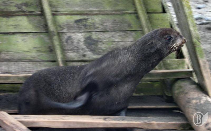 Сделав снимок, оставил секача и, маскируясь за большим деревянным помостом, подошел как можно ближе к одному из гаремов. А когда подошел впритык к помосту, вдруг увидел, что под ним преспокойно отдыхает большой котик-самка. Появления человека она не почувствовала, что дало мне возможность сделать несколько снимков с расстояния полтора метра. Лишь после того, как другие котики в гареме, заметив меня, подняли шум, самочка проснулась, испугалась и заспешила к воде.