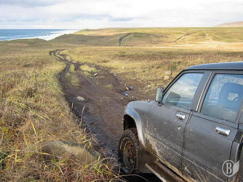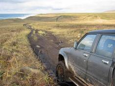 Конечно же, я хотел увидеть этих животных, ведь побывать на Командорах и не увидеть их было бы неправильно. Через 15 минут я сидел в салоне японского „джипа” и ехал на северный запад острова вместе с двумя алеутами – Федором Горшковим и Михаилом Удачиным. Грунтовка, по которой мы медленно продвигались вперед, опять напоминала мне дороги Шикотана – по ним может проехать только полноприводная машина. Колея петляла по тундре, после дождей образовались много больших луж, да и камней на дороге были немало.