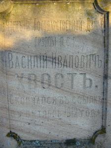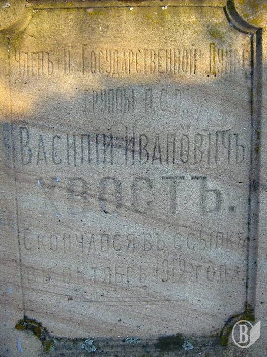 В одном из залов музея, экспозиция которого посвящена событиям начала ХХ века, мое внимание привлекло фото могильной плиты со старого городского кладбища. На плите была такая надпись: „Василий Иванович Хвост. Член партии эсеров, депутат II Государственной Думы от Черниговской губернии. Скончался в ссылке в октябре 1912 года”. Конечно, меня как историка очень заинтересовала могила этого человека, и я решил ее отыскать. Но сначала попробовал узнать какие-то подробности о его биографии у сотрудников музея. К сожалению, никто из них о Василии Хвосте ничего подробного сообщить не мог. Но как найти его могилу, подсказали.