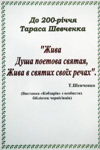Виставка відкрилася до майбутньому ювілею - 200-річчю від дня народження генія української літератури Тараса Шевченка відбулося відкриття виставки «Кобзарів» - видань кращих творів Т.Шевченка різних років.
