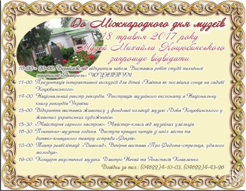 До Міжнародного дня музеїв 18 травня Чернігівський літературно-меморіальний музей-заповідник Михайла Коцюбинського запрошує чернігівців та гостей міста відвідати культурно-мистецькі заходи.
