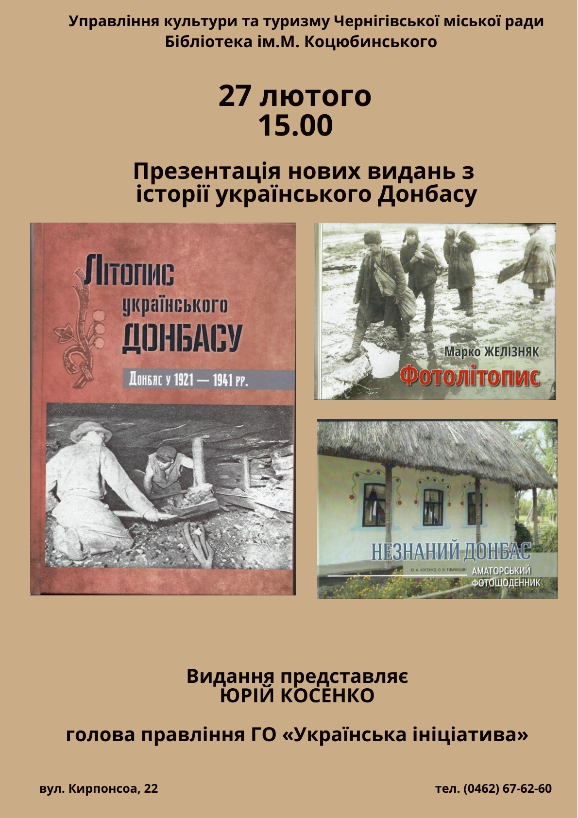 27 лютого о 15.00 чернігівців запрошують до бібліотеки ім. М. Коцюбинського на презентацію книжкових видань 2019 року про український Донбас.