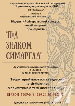 Громадська організація «ДіяСлова» спільно з Управлінням у справах сім’ї, молоді та спорту, Управлінням культури та туризму Чернігівської міської ради та Чернігівською міською комунальною ЦБС оголошує відкритий літературний конкурс для дітей та молоді «Під знаком Симаргла», приурочений до 398 річниці надання Чернігову магдебурзького права 27 березня 2021 року.