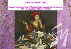 28 жовтня о 12.00 у великій читальній залі Чернігівської ОУНБ ім. В. Г. Короленка (просп. Миру, 41), у межах проєкту "Видатні жінки Чернігівщини" відбудеться мистецький захід на тему "Видатні літераторки Чернігівщини другої половини XIX – першої половини ХХ ст.", за участю краєзнавців та літературознавців Чернігівщини.