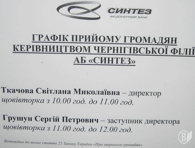 «В зв'язку з тимчасовою відсутністю в Kaci банку необхідної Вам суми готівкових коштів, що є наслідком фінансової та політичної нестабільності в країні, ЧФ АБ «Синтез» на жаль, на даний час не може виплатити Вам грошові кошти за депозитним договором.