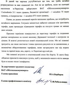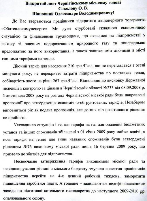 Просимо терміново повернутися до перегляду тарифів за поданими раніше матеріалами на основі висновку Державної інспекції з контролю за цінами. В жовтні розпочнеться новий опалювальний сезон. Ми всі повинні зрозуміти, що лише своєчасна і повна проплата рахунків не за заниженими, а економічно обґрунтованими тарифами, може застрахувати нас від втрати тепла та гарячої води, яка, доречі, є в Чернігові круглий рік.