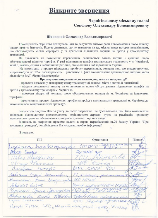 На засіданні клубу громадськими організаціями міста, було підписане відкрите звернення до міського голови з проханням виконати ряд дій з метою недопущення необґрунтованого підвищення вартості проїзду в міському пасажирському транспорті.