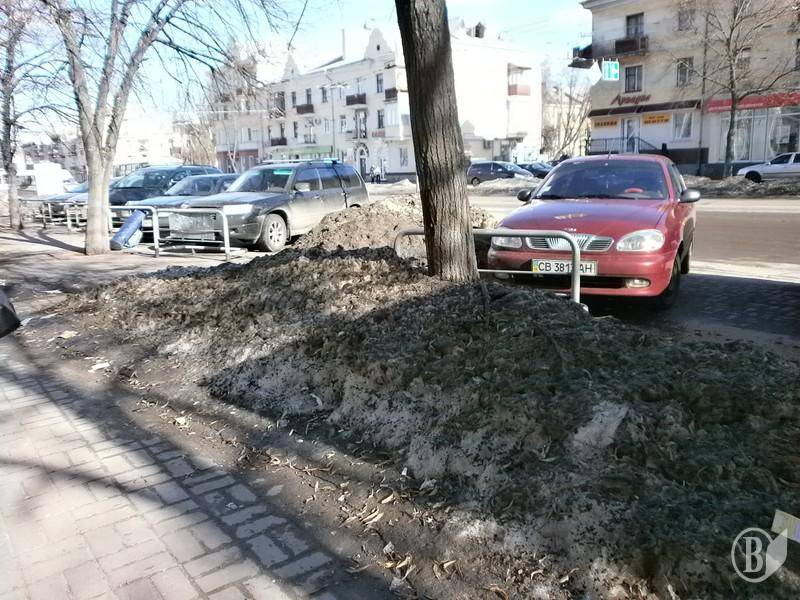 Комунальні служби не вважають за потрібне прибирати їх. Ще день, тиждень і розтанувши, весь цей бруд потече каналізаційними колекторами в Стрижень, Десну, приміські озера.