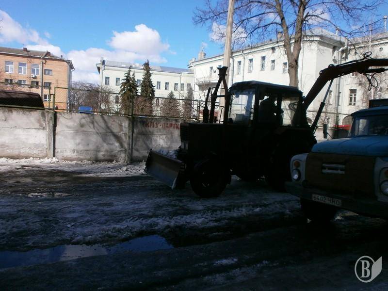 А в цей час за дворами обласної а адміністрації працюють необхідні технічні засоби вивозячи білосніжний сніг.