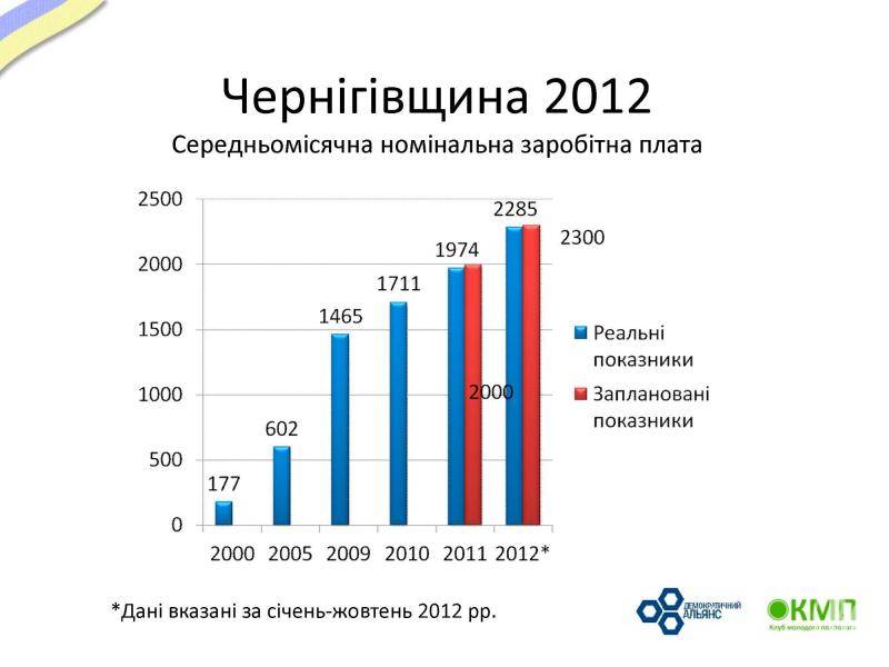 Майже співпадає з запланованою і рівень заробітних плат в області. Так, запланована середньомісячна номінальна заробітна плата в 2012 році складає 2300 грн. Реальні показники за січень-жовтень 2012 року – 2285. Проте маємо всі підстави вважати, що реальні показники максимально наблизяться до запланованих. В 2013 році п’ятирічка обіцяє середньомісячну номінальну заробітну плату в розмірі 2680 грн.