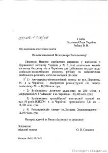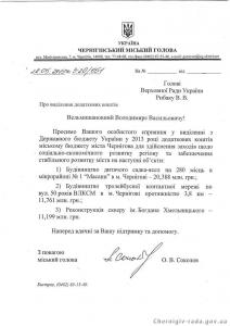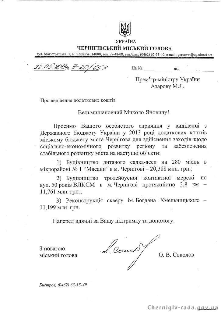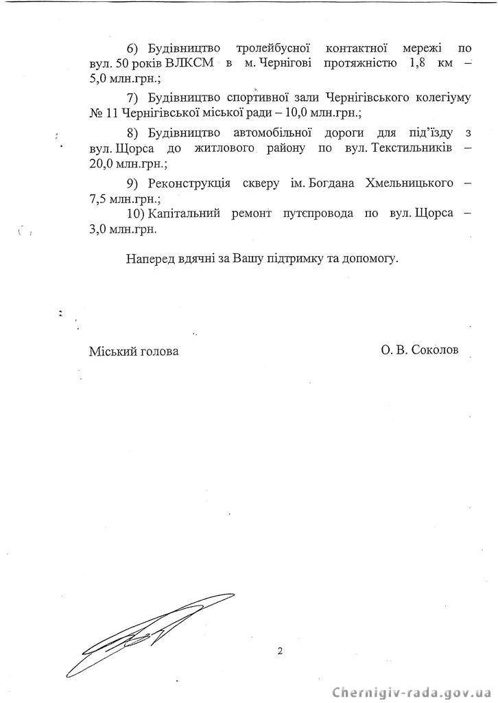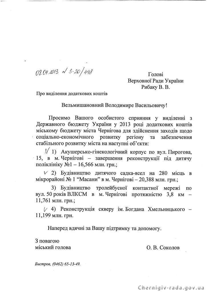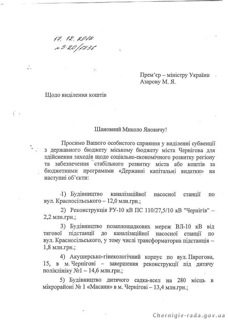 За словами керівника міста, міська рада неодноразово зверталася до Прем'єр-міністра України Миколи Азарова та Голови Верховної Ради України Володимира Рибака щодо виділення коштів на фінансування проектів у Чернігові, що вже мають затверджену проектно-кошторисну документацію. За підсумками звернень, є відповідні доручення бюджетному комітету Верховної Ради України.