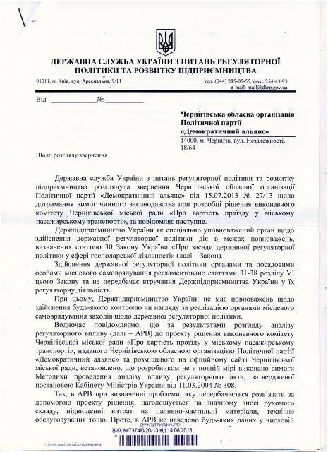 Державна служба з питань регуляторної політики та підприємництва розглянула скаргу Чернігівської організації ДемАльянсу і підтвердила необґрунтованість підвищення проїзду, закладеного в рішенні виконавчого комітету Чернігівської міської ради «Про вартість проїзду у міському пасажирському транспорті».