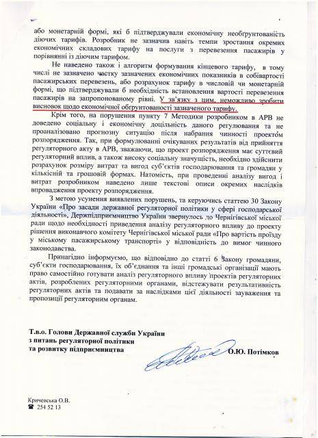«Держкомпідприємництва фактично підтвердило те, що влада не має жодного обґрунтування для підвищення проїзду. Тому чернігівські чиновники мають згадати про відповідальне ставлення до ухвалення будь-яких рішень, а тим більше тарифів. Ми їм про це нагадаємо і тому звертаємось в Прокуратуру м. Чернігів для вжиття заходів прокурорського реагування».