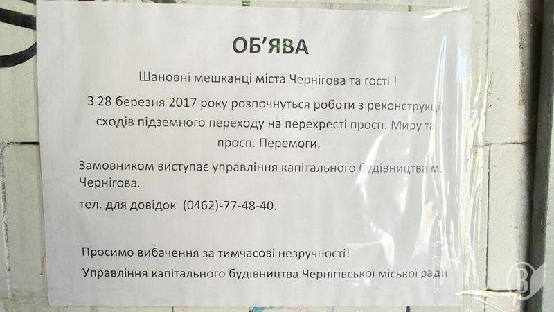 Розпочався обіцяний ще торік ремонт у підземному переході на перехресті проспектів Миру та Перемоги у Чернігові.