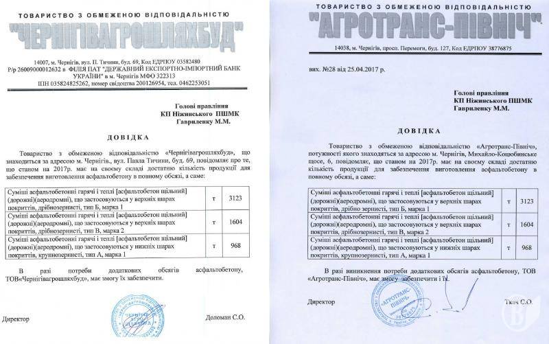 «Авжеж, чернігівські виробники асфальтобетонних сумішей: ТОВ "Чернігівагрошляхбуд" та ТОВ "Агротранс - Північ" – це два різних суб'єкта господарювання, які жодним чином не пов'язані між собою, які ажніяк не зловживають своїм монопольним становищем в місті і які звісно не контролюються чернігівським міським головою, – зробив саркастичний допис активіст Олександр Гашпар. – Ну подумаєш, майже повністю збігається шрифт і текст в довідках, виданих різними суб'єктами господарювання, але ж Чернігів, як і загалом Україна – це територія чудес, фантастичних історій та неймовірних збігів».