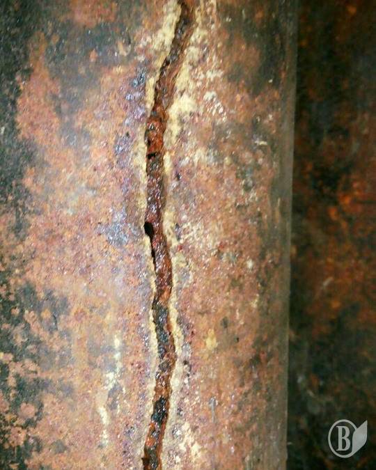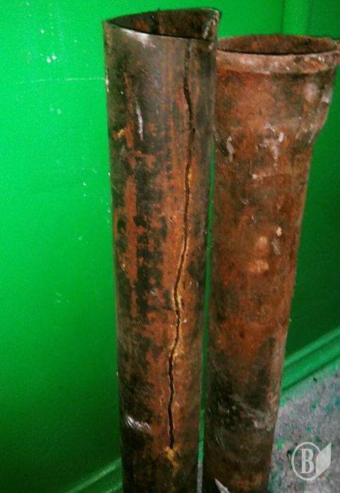 Ще вчора ввечері мешканець 9-го поверху переконував працівників компанії, що в нього проблем з каналізаційною мережею не існує, а значить і міняти її непотрібно. Але на вимогу управляючої компанії ремонтників все ж таки допустили до мереж. Те, що побачили після розкриття каналізаційного колодязя – шокувало. Чавунна труба була тріснута в кількох місцях. Витоки з труби потрапляли на зовнішню стіну будинку і руйнували її. Вода, потрапляючи на стіну, вимивала розчин поміж цеглою. І досі наслідки витоків з каналізаційної мережі будинку можна побачити на зовнішній стіні будинку…