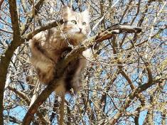 На дереві сидить кіт і по-весняному позирає на кішечок біля під’їзду будинку . Такий погляд у нього буває тільки у квітні. Бо в інші місяці він так спостерігатиме на полюванні за пташками.