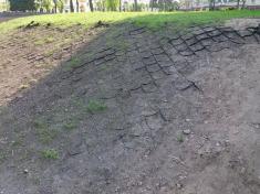 У сквері Хмельницького в Чернігові після торішньої реконструкції, яка начебто завершена, чернігівці дивуються рішенню щодо укріплення схилів такою собі «гумовою стрічкою», викладеною на ребро хрест-навхрест.