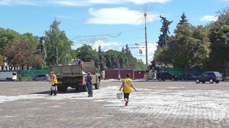 Жителів міста може здивувати факт, що центральна площа Чернігова побіліла. Це працівники КП АТП-2528 посипають клінкер сіллю, аби площа не позеленіла.