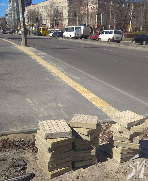 На вулиці Рокосовського в Чернігові починають замінювати жовту тактильну плитку «для сліпих», котра вже в перший рік лежання перестала бути тактильною, а часом і плиткою.