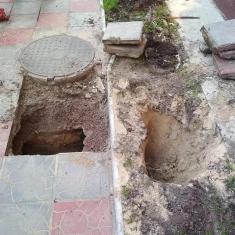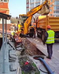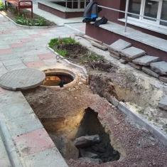 КП Чернігівводоканал виконує гарантійний ремонт каналізаційних мереж за рахунок забудовника. Вартість ремонту і конкретні причини утворення провалу ґрунту будуть відомі після закінчення робіт.