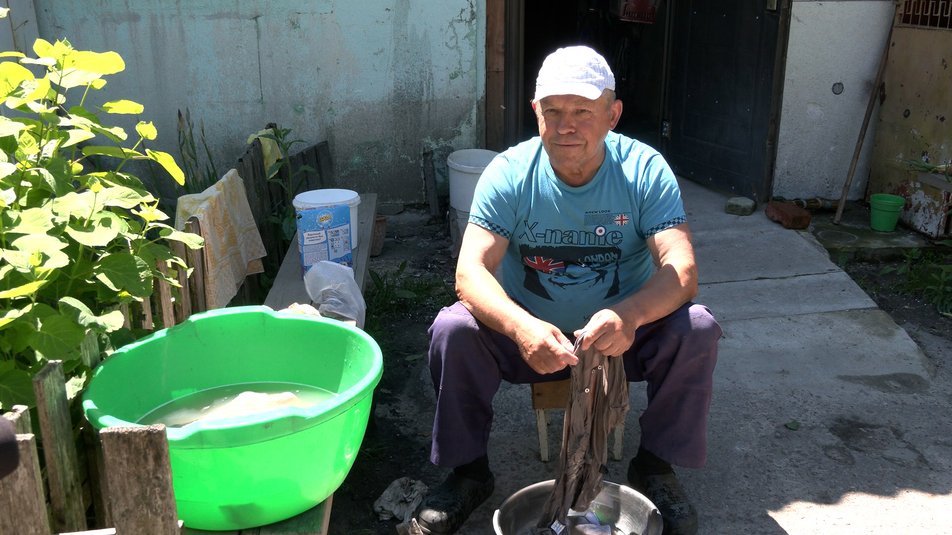 Люди, які не мають газових балонів і світла, вимушені готувати їжу на вулиці. Володимир Донець і пере надворі.