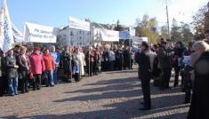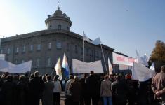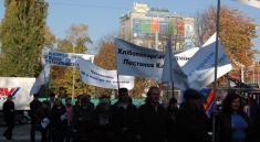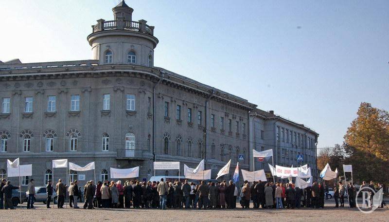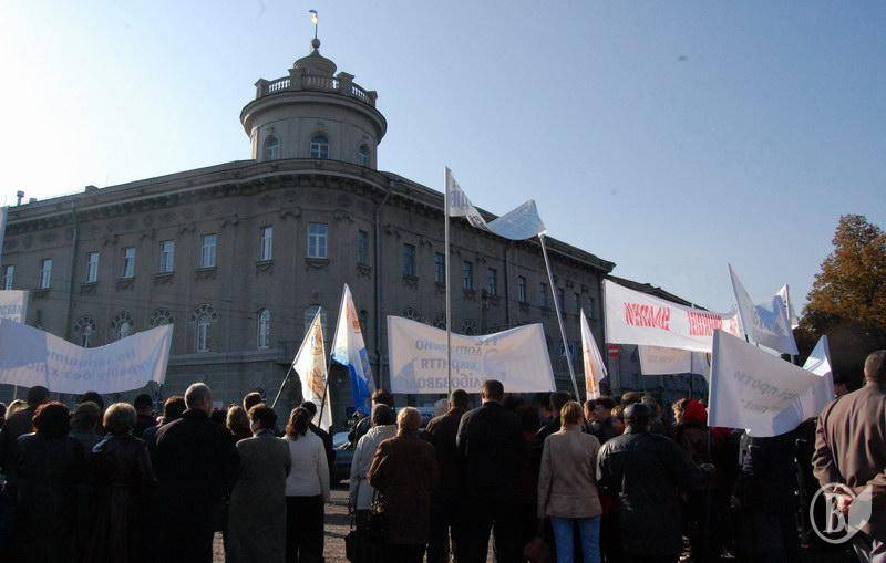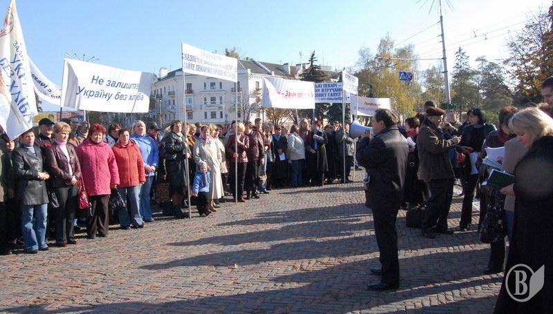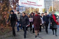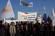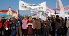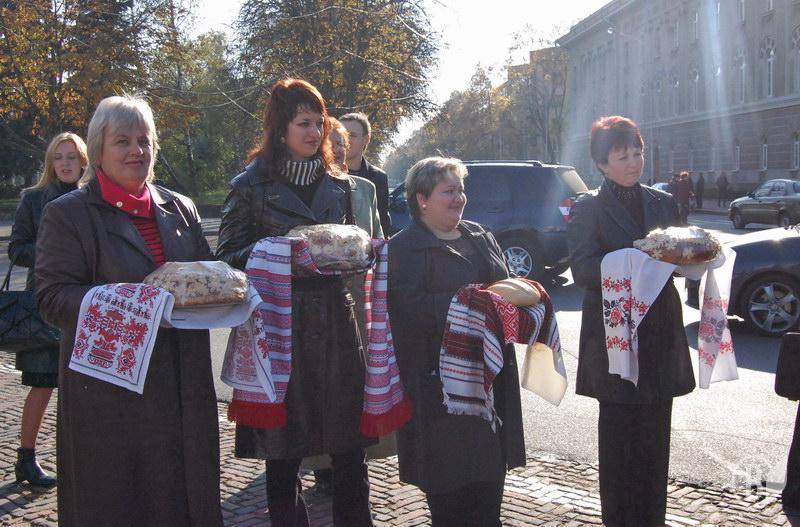 З короваями в руках і плакатами мітингувальники колоною пройшли центральними вулицями міста до площі і зупинилися навпроти будівлі облдержадміністрації. Їх мета – вимагати збільшення рентабельності з 5 до 10%.