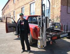 Машина со специальным устройством, которое проверяет плодородие почвы, и ее водитель Андрей