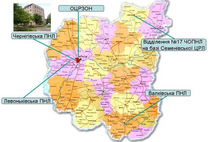 - Трьома психіатричними лікарнями (Чернігівською обласною психоневрологічною на 965 ліжок, Валківською в Прилуцькому районі на 80 ліжок та Леоньківською в Чернігівському районі на 135 ліжок).
