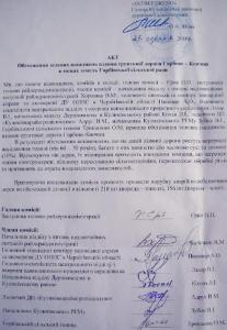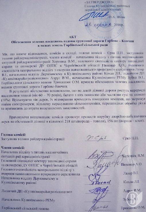 В результаті обстеження було встановлено, «що на даній ділянці дороги ростуть перерослі насадження - тополі віком 60-70 років, багато з них повністю або частково сухі чи зламані лініями електромереж. Вони заважають вільному пересуванню сільськогосподарського транспорту, обробці ріллі тощо». Комісія рекомендувала провести вирубку аварійно небезпечних дерев на обстеженій ділянці в кількості 218 штук (тополі та клени). Такий же акт був складений щодо ділянки лісополоси Горбове-Ковчин.
