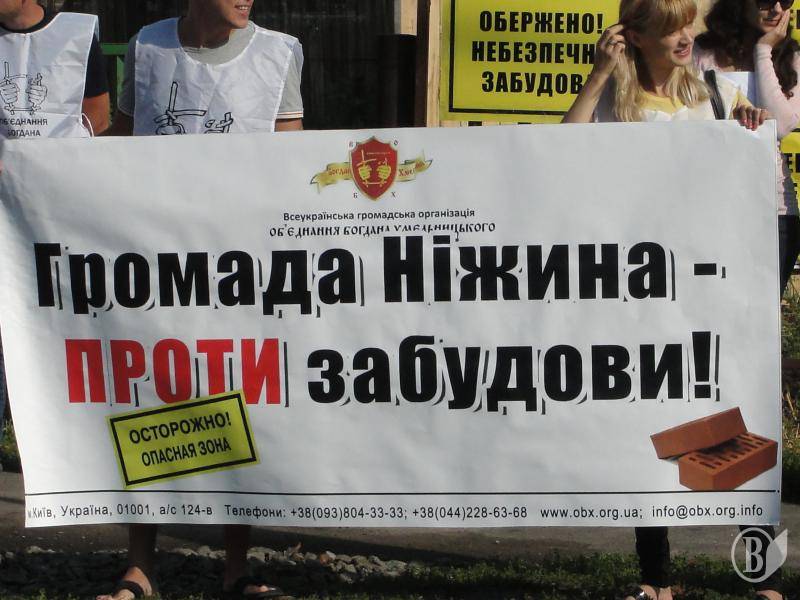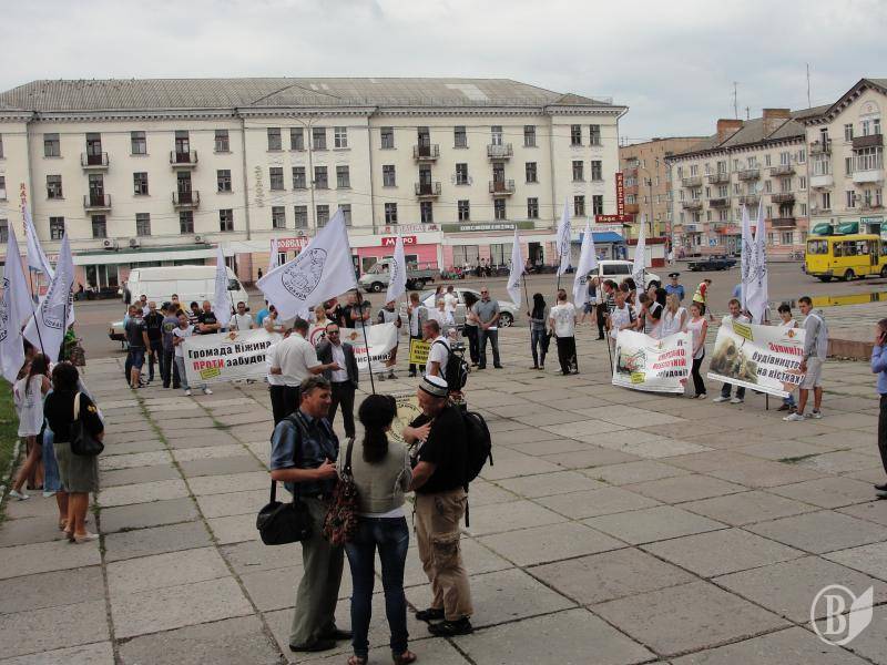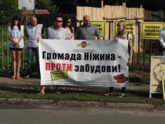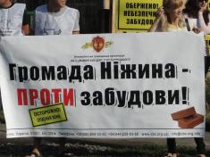 Активісти Ніжина, які вийшли на вулицю, вимагають зупинити незаконну забудову. Мітингувальники вимагають у місцевої влади захисту інтересів громади, а не фінансових інтересів «депутатів-бізнесменів».