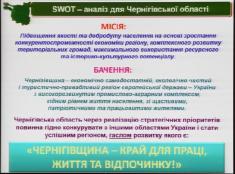 Она проанализировала сильные и слабые стороны и возможные внешние влияния (возможности и угрозы) на последующее социальное и экономическое развитие Черниговской области.