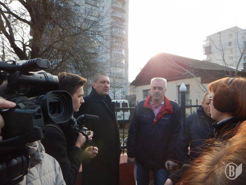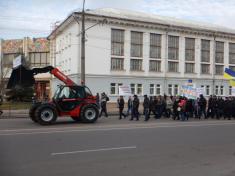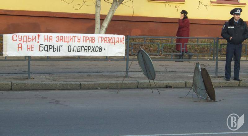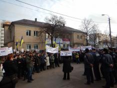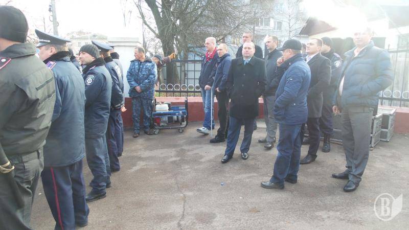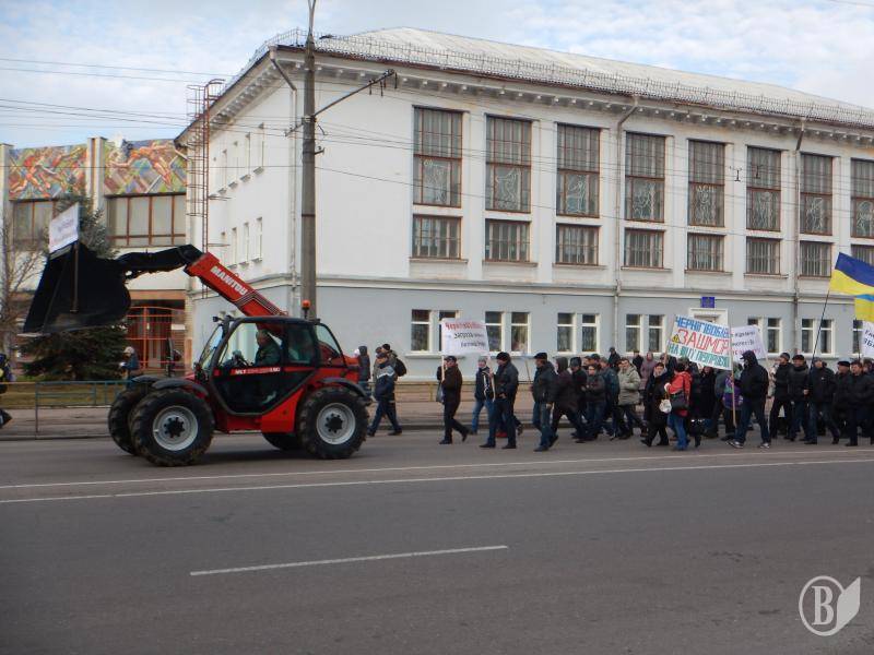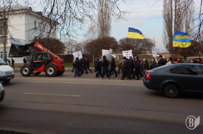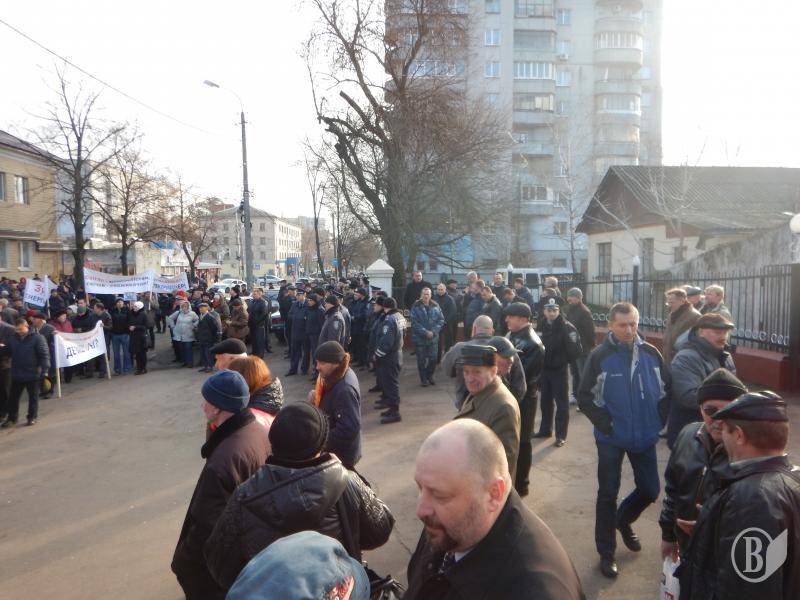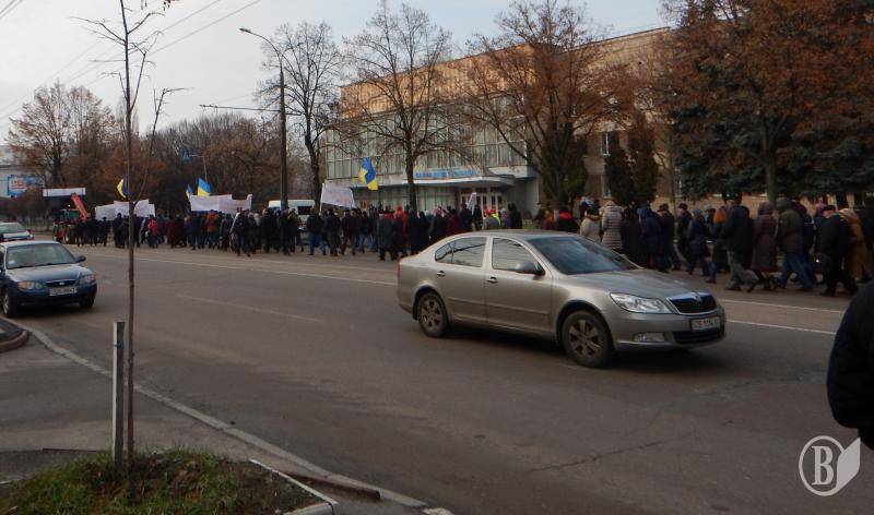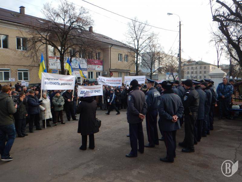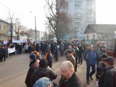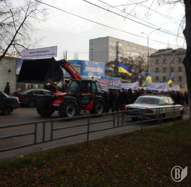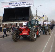 Потім протестувальники вишикувалися в колону - загалом близько 600 чоловік – і пройшли по проспекту Перемоги до приміщення компанії «Чернігівобленерго». Там вишикувався кордон з 2 двох радів міліції, за яким на підвищенні, як на трибуні стояло керівництво компанії. Голову правління Ткача охороняв чи не найбільший у Чернігові охоронець.