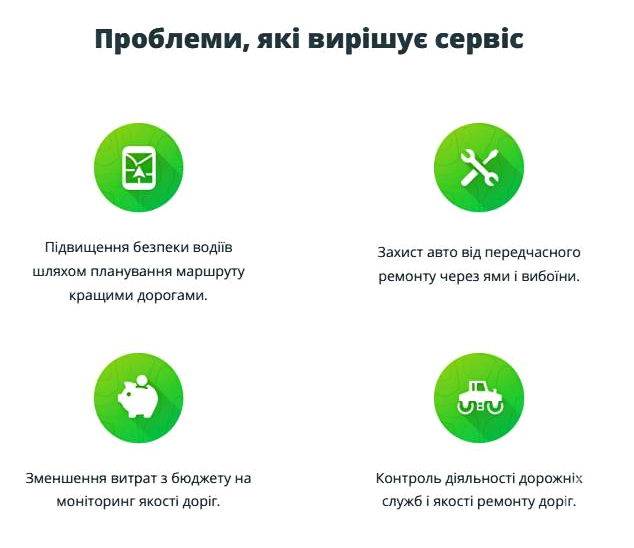 В свою очередь местной власти и дорожным службам сервис UAROADS позволяет видеть и анализировать состояние дорог и определить приоритетные для ремонта. А общественность может контролировать изменение состояния дорожного покрытия в соответствии с задекларированным дорожниками объемом ремонта.