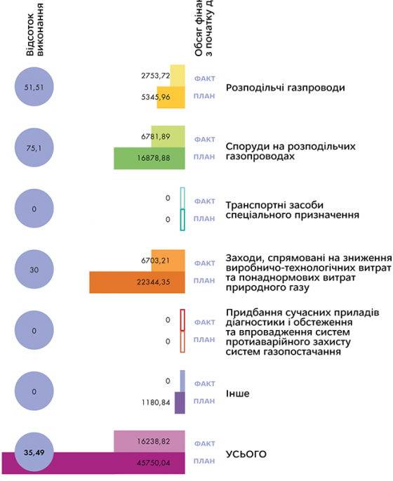 Фінансування інвестиційної програми ПАТ «Чернігівгаз» на 2015 рік складає 45750 тисяч грн. Виконання інвестиційної програми склало 35,49%.