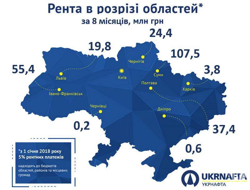 За останніми оцінками, у 2018 році «Укрнафта» сплатить близько 6,4 млрд грн ренти, а, отже, до бюджетів областей, районів та громад надійде біля 320 млн грн доходів від рентних платежів.