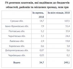 Найбільші відрахування з рентної плати, як і в попередні місяці, надійшли до громад Сумської, Івано-Франківської та Полтавської областей. Зокрема, Чернігівська область отримала 24,4 млн грн.