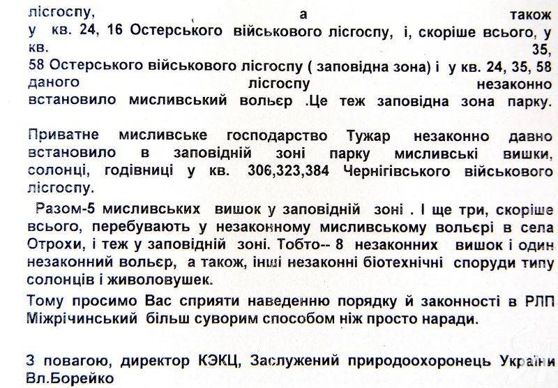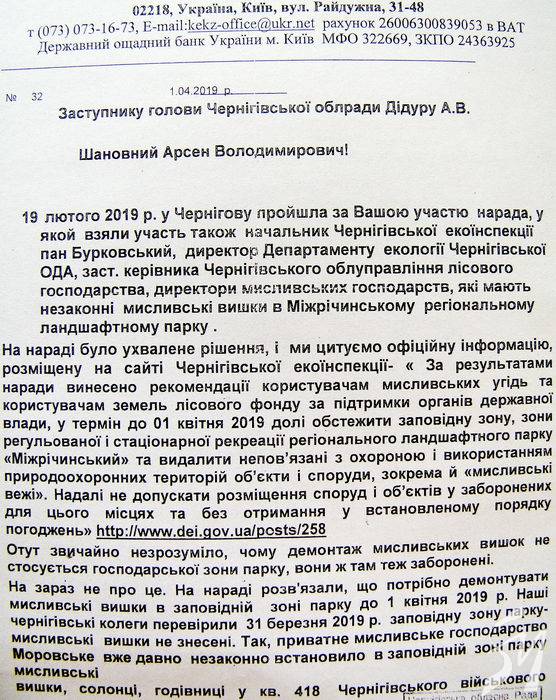 Згідно із законом на таких заповідних територіях не повинно бути мисливських веж та вольєрів. Встановлені вони були за погодженням з попередньою адміністрацією регіонального ландшафтного парку Міжрічинський, якої нині немає.