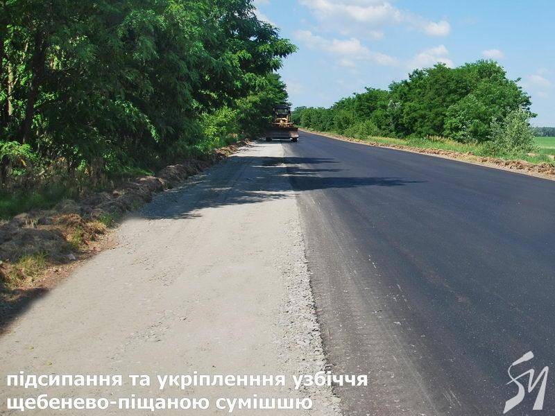 Поблизу села Петрове Чернігівського району на ділянці поточного середнього ремонту дороги Н-27 Чернігів-Мена-Сосниця-Грем'яч (км 23-26) триває підсипання та укріплення узбіччя щебенево-піщаною сумішшю.