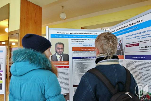 В фойе университета были развернуты выставки о специальностях. Студенты учебных заведений радостно встречали их и выступали в роли консультантов.