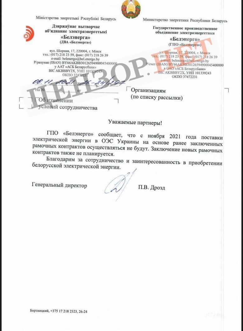 "ДВО "Біленерго" повідомляє, що з листопада 2021 року постачання електричної енергії до ОЕС України на підставі раніше укладених рамкових контрактів здійснюватися не будуть. Укладання нових рамкових контрактів також не заплановане", - сказано в документі.